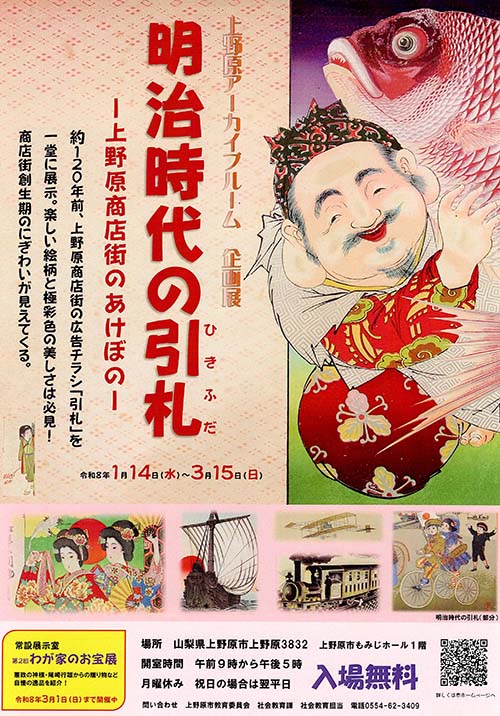 今日はもみじホールのロビーで打ち合わせの会議がありました。同じフロアのアーカイブルームで、「明治時代の引札-上野原商店街のあけぼの-」企画展が開かれていました。色鮮やかな引札(広告チラシ)が展示されていました。