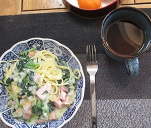 そうした緊迫した中でも、通常の世界に戻ってきました。昼も通常に。ほうれん草とベーコンのクリームパスタを作りました。