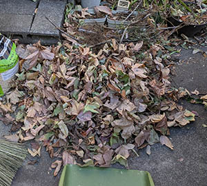 街路樹もほぼ葉を落とし終わりましたが、風で吹き寄せられた落ち葉が駐車場に溜まっていました。45Lの袋に入り切らない程でした。