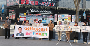 昨日、甲府駅南口で日本共産党街頭演説会が開かれました。今回の総選挙に出馬しないと表明した志位和夫議長、その議席を引き継ぐ、元衆議院議員はたの君枝さん、元衆議院議員さいとう和子さんの三人が訴えをしました。志位議長は、33年の議員生活を振り返り、論戦では歴代首相に負けたことはないと強調しました。そのうえで、今回の総選挙の争点は、①労働者の賃金を引き上げること、②賃下げなしに労働時間の短縮を図ること、③消費税の廃止、当面5%へ減税、④患者への負担増となる医療費削減に反対すること、⑤財源は大儲けをしている富裕層、大企業に適正な課税をと訴えました。