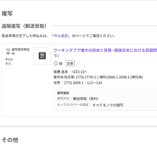 複写サービス(郵便受取)を申し込みました。便利になったものです。他にもほしい本がありましたが、こちらは古本で、ネットで注文しました。