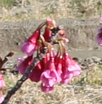 カンヒザクラの樹を見つけました。濃紅色、下向きの半開する花弁、沖縄県に自生すると言われている樹です。石垣島には、自生しているカンヒザクラが国の天然記念物に指定されています。中国南部や台湾に分布しています。